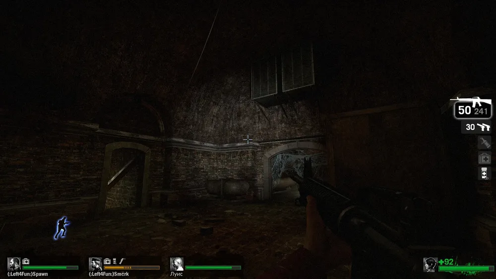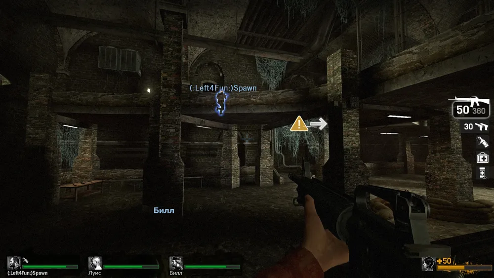Однако на этой карте главная наша задача не побродить по некогда роскошному поместью и пострелять зомбей, а вызвать спасателей. Для этого один из членов команды должен залезть на чердак и включить радио. К чердаку ведут вот такие стрелки по всему дому: