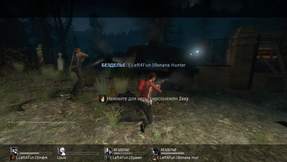Сразу же после этого вы должны бежать на улицу, о чем, впрочем, если вы вдруг замешкаетесь, вам сообщат и сами герои. Сразу же к вашему выходу из дома *о_о* на вертолетной площадке вас будет ожидать, видимо, волшебник в голубом вертолете.*Таки волшебник, не иначе, ато как бы он меньше чем за минуту прилетел??* Однако, играя в первый раз, даже уже подбегая к вертолету, чувствуешь одним местом, что какой-то тут подвох, ибо только вторая карта, и выжившие ну никак не могут сейчас так легко и просто улететь восвояси. Так оно и есть. Как только кто-то из четверки приближается к вертолету более чем на 10 метров, тот вдруг взлетает, и...падает. *Совсем нелогичный, да* После этого всей команде не мешкая нужно бежать к зданию, подход к которому открыл вертолет, сломав забор, преграждавший путь. Однако здесь будьте осторожнее! Возле вертолета куча багов, в которые легко угодить и застрять. Вот, кстати, несколько скриншотов, когда мы с товарищами все трое находимся в "подвешенном состоянии":