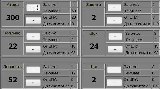 После набора минимума в 52 очков, вы можете качать выбранный параметр до 288 ловкость или 292 атаки.