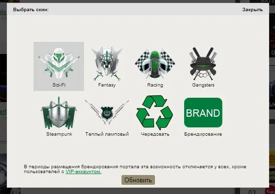 Выбранный скин в дни брендирования смогут ввидеть только VIP-пользователи. Что такое VIP-акаунт, можно почитать в нашей суперсправке.