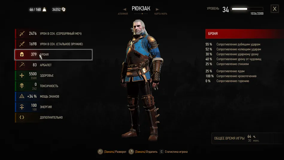 7. Почему это важно? Урон Геральту рассчитывается так: Итоговый урон = (урон – показатель брони) * (100% - общая сопротивляемость). Как видно, количество брони играет минимальную роль на средних и поздних этапах игры, а вот сопротивляемость урону – это самое главное. В связи с этим надо всегда носить с собой 2 брони (речь идет о собственно доспехе, другие элементы брони – штаны, сапоги и перчатки у меня всегда школы Кота, и они не меняются) – одну против людей (с максимальным сопротивлением против колющего, ударного и рубящего урона), а другую – с сопротивлением урона против чудовищ и животных. В итоге у меня следующий набор брони для билда: штаны, перчатки, сапоги – всегда школа Кота – для увеличения урона быстрых и критических атак и восстановления энергии; лучший доспех против чудищ и животных – доспех Медведя; против людей – сначала Нифгардский доспех (10 ур), покупается у квартиртмейстера Кровавого барона; далее доспех с Ундвика (16 ур), покупается у кузнеца во дворце на Скеллиге; далее доспех Ласточки, который получаем, убив Архигрифона 33 уровня по ведьмачьему квесту (делал его на 30 ур); и, наконец, доспех рыцарей Пылающей розы (36 ур), рецепт которого находим в Каменных сердцах. Есть еще Турнирный доспех Туссентского рыцаря (48 ур), который добавляет по 3% сопротивления к каждому из 3 видов урона против людей, в сравнении с предыдущем доспехом, но я его не использовал.