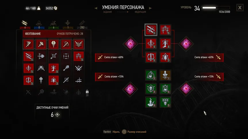 2. Все меняется на 18 уровне (до этого момента я уже открыл все Места Силы в Белом Саду, Велене, Новиграде и Скеллиге). Обнуляем свои навыки- всего будет доступно 37 очков. Мой билд для основной игры следующий: память тела, точные удары, вихрь, легкость ног, решительность, контратака, техника школы кота, повышенная сопротивляемость, приобретенная стойкость, ужас, освежающий напиток, синергия.