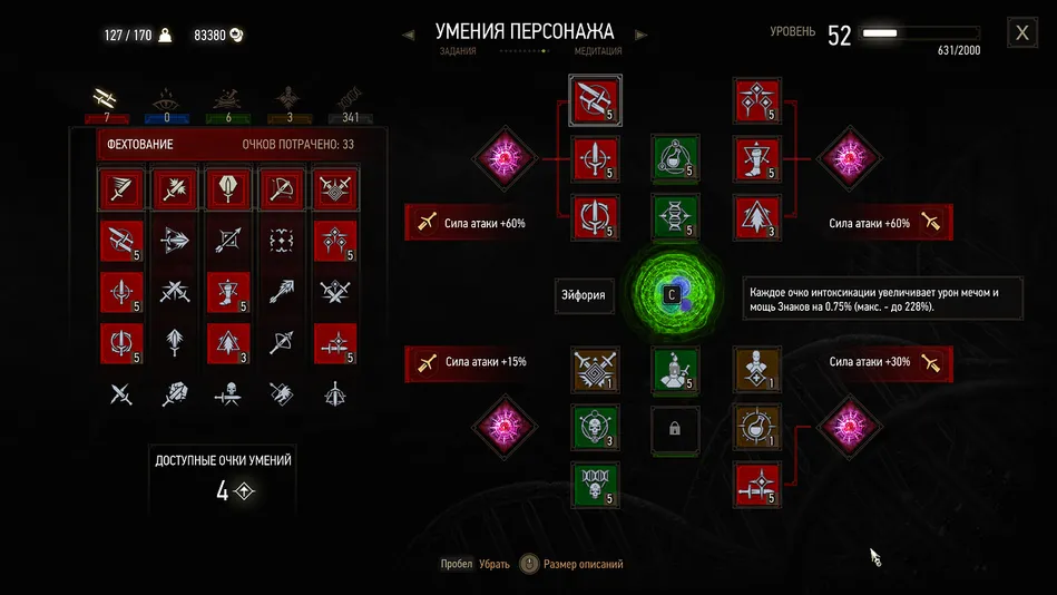 11. Для дальнейшего усиления билда в дополнениях, после выполнения квеста про мутации профессора Моро, открываем мутацию «Эйфория», которая дает +228% к силе ударов, при выпивании 4 отваров. Вложив 15 очков умений и 18 больших мутагенов, можно открыть еще 3 из 4 ячеек навыков. Первым – обязательно выбираем контроль метаболизма – дает +30 к токсичности, чтобы выпивать 4 отвара, второй – лезвие бритвы + 1 очко адреналина в начале боя – для Вихря. Третий навык – по желанию, я выбираю боевое безумие, которое дает +8% к шансу критического удара за каждое очко адреналина(3 очка + 24%). Можно вместо него взять убийственный кураж, он дает больший прирост крита, но работает только при нескольких противниках.
