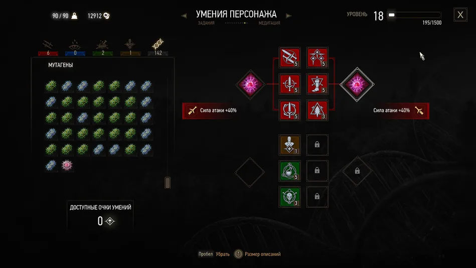 10. Чтобы достичь максимальной силы ударов, во все слоты под мутагены изначально надо вкладывать только большие красные мутагены, несмотря на то, что красные умения будут только в первых 6 ячейках. Где их найти? На 13 уровне (не раньше!) плывем на Скеллиге (в броне Грифона). Активируем все возможные места Силы, а потом идем собирать малые красные мутагены. Ниже поселка Редгилль и на Кладбище китов (сначала там бандиты) респаунятся утопцы 18 уровня, с которых падает малый красный мутаген. Для повтора их появления надо вернуться в Новиград или Велен, а потом опять вернуться на Скеллиге. Примерно за час можно набить 18 необходимых мутагенов для первых 2 больших красных мутагенов, и получить +1 уровень. В районе 25-26 уровня имеет смысл повторить процедуру, чтобы собрать еще 2 больших красных мутагена.