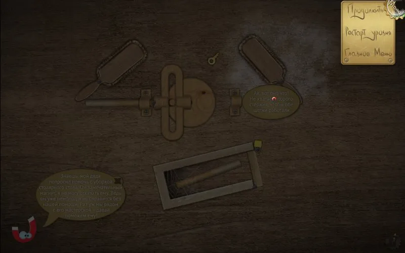 В этой игрушке дается маленький магнит, с помощью которого можно двигать всякого рода металлические предметы - именно металлические, никакая другая пластмасса или дерево не смещается. Подтолкнуть их, впрочем, можно шестеренкой, винтиком, лампочкой и тому подобными предметами - всеми теми, которые, по мнению, авторов содержат хотя бы грамм металла.