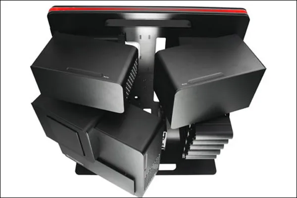 Главная особенность анонсированного ПК — оригинальный корпус, создававшийся при поддержке дизайнеров BMW Designworks. Он имеет модульную конструкцию, предполагающую использование отдельных «контейнеров» для каждой части системы. Это обеспечивает быстрый доступ к тому или иному элементу компьютера и упрощает модернизацию десктопа или замену комплектующих. В отсеках материнской платы и накопителей предусмотрены вентиляционные отверстия, а за охлаждение процессора и видеокарт отвечают мощные вентиляторы.