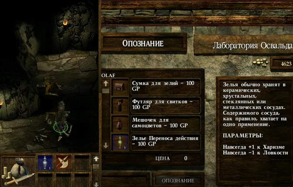 В следующей пещере со мной заговорил скелет: не иначе – «Босс». У него в руках оружие – значит, ничего серьёзного. Оставил после себя топор и… неопознанную бутылку. (Когда я её подобрал – услышал, как создатель издал изумлённый возглас: волнуется, наблюдает.) Позже оказалось, что это зелье (совершенно неизвестное создателю!) позволяет улучшить привлекательность за счёт ловкости.