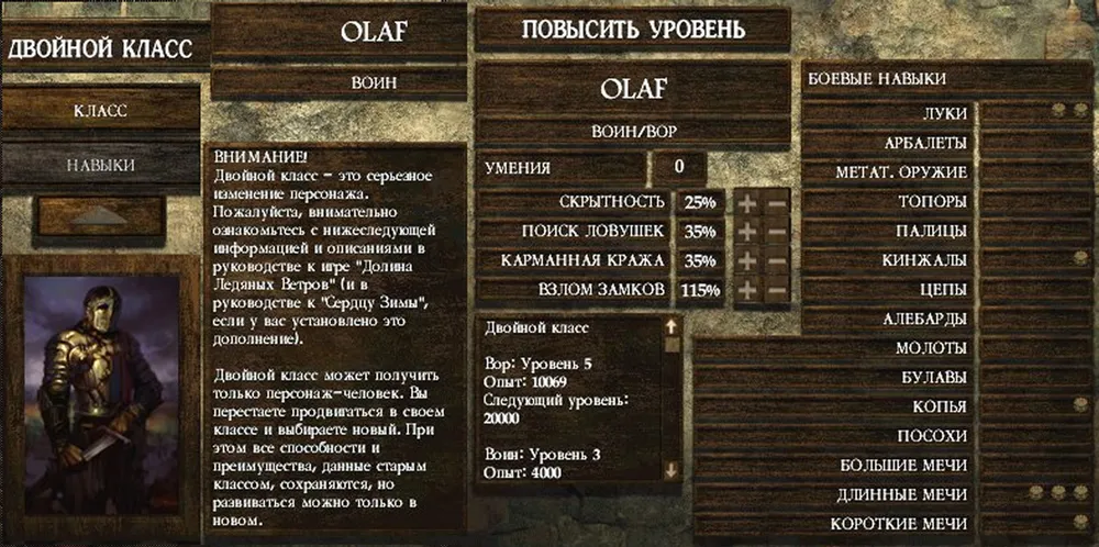 Если вы решите создать героя дуал-класса, то помните, что его характеристика во втором классе должна быть не ниже семнадцати единиц. То есть, воин обязан иметь интеллект 17, иначе не сможет стать магом. Мировоззрение также способно создать препятствие для дуалирования: законопослушный воин не сможет стать вором.