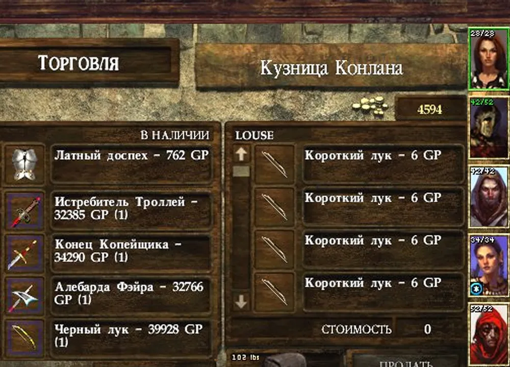 В нашем случае группа, отдыхающая в таверне, состоит из паладина (человек), барда-полуэльфа и трёх воинов (после третьего уровня будут дуал-классированы). Получаем предложение принять участие в походе: следовательно, нужна экипировка; шестами много не навоюешь. Начинаем с самого простого: бард поёт песенки,