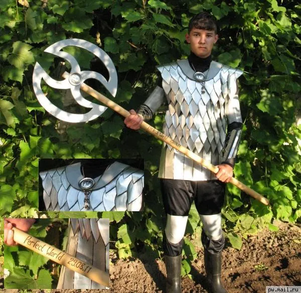Получает автор с интересным именем barano1999. Костюм навевает воспоминания то ли о фильме "Приключения Буратино", то ли об уроках ИЗО в начальной школе. Особенно умиляют картонные топоры.