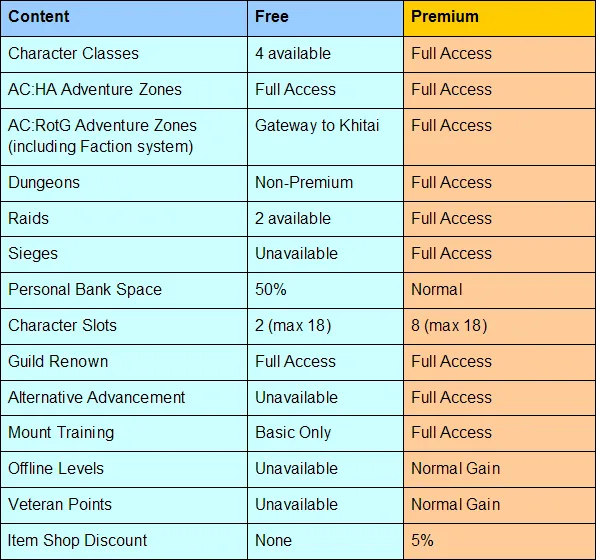 Премиальные подписчики будут лишены озвученных выше ограничений с бонусами в виде 5% скидок в игровом магазине и 8 слотов для персонажей (максимально возможны 18, но остальные 10 придется докупать). Сравнительную таблицу возможностей можно посмотреть на прилагаемом к новости изображении.