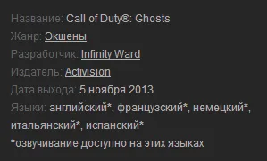В системе Steam начался сбор предварительных заказов на новую часть Call of Duty, с подзаголовком Ghosts. Информации о бонусах пред. заказа пока нет, по слухам она должна появиться ближе к выходу игры. Что интересно: табличка на странице с игрой информирует, что мы заказываем RU-версию игры, а в языках то русского языка нет! Может просто забыли приписать русский...