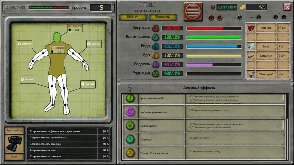 4. Ах, да. Выживать придётся по полной программе. Голод, жажда, недосып ослабят вас, а в особо запущенных случаях могут даже и убить. Хотя в начале игры провианта вполне достаточно, следить за уровнем всех параметров надо обязательно.