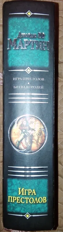 Послесловие. Само издание книги на русском языке также очень понравилось. Первые две части можно купить в одной большой зеленой книги. В книге 1125 страниц + приложение "Королевские Дома". Бумага приятная на ощупь, обложка твердая и приятного зеленого цвета. Посередине красивый рисунок. А также позолоченными буквами написано имя автора. Такое "зеленое" издание включает в себя две части - "Игра Престолов" и "Битва Королей".