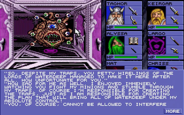 Книга захватила мое воображение сразу же, буквально с первой страницы. До сих пор вспоминаю, как отправляются в дозор за стену рыцари и некий молодой лорд, ведущий себя крайне безмятежно. Вокруг него опытные воины, которые не раз бывали в боях и не понаслышке знают, что “за стеной” в великом и древнем лесу, куда они идут, водятся опасные создания - от лютоволков до одичалых. Мне эта сцена напомнила темное фентези на манер Dungeon and Dragons, я почему-то тут же вспомнил про Eye Of The Beholder 3.В этой игре герои попадают в подземелье города, которое полно нежити. И мы вместе с 4 смельчаками исследуем это многоуровневое подземелье.