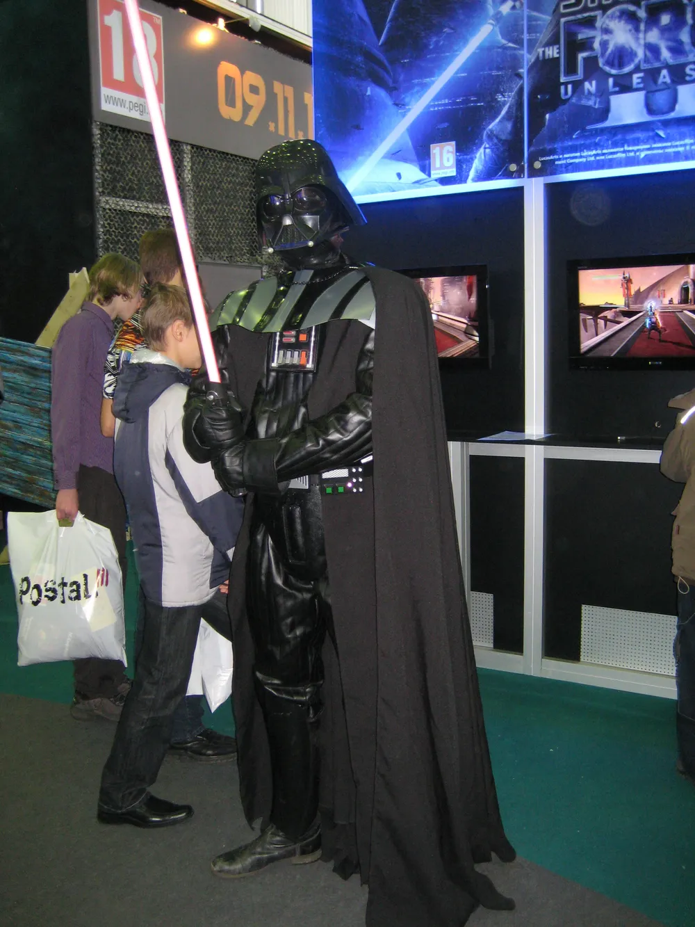 Дарт Вейдер поджидал падаванов около стенда с Force Unleashed 2. Все-таки на PS3 после привычного компьютера в нее очень неудобно играть. Даже не получилось пройти "Дорогу смерти" в режиме испытаний, хотя на персоналке справлялся без особых проблем.