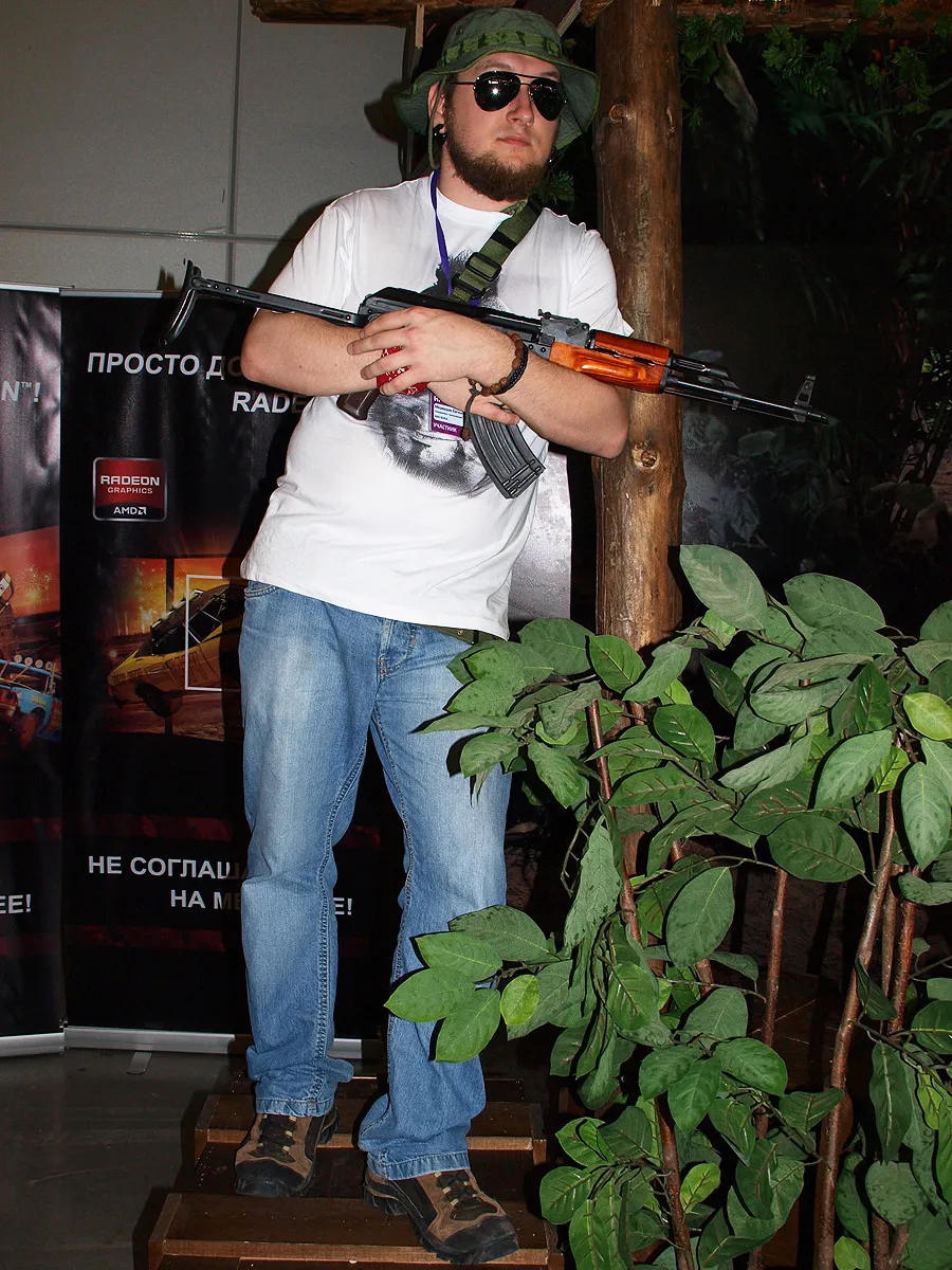 Один из многочисленных конкурсов, проводящихся во второй день. Пока косплеер-военный занят, один из зомбиков попытался увести автомат (лежащих на заднем плане на сцене).
