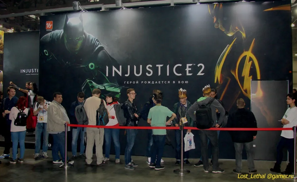 На стенде WB Games проводилась демонстрация геймплея Injustice 2 с комментариями. Сразу же вслед за ней запускали трейлер с Харли Квинн и Дэдшотом.