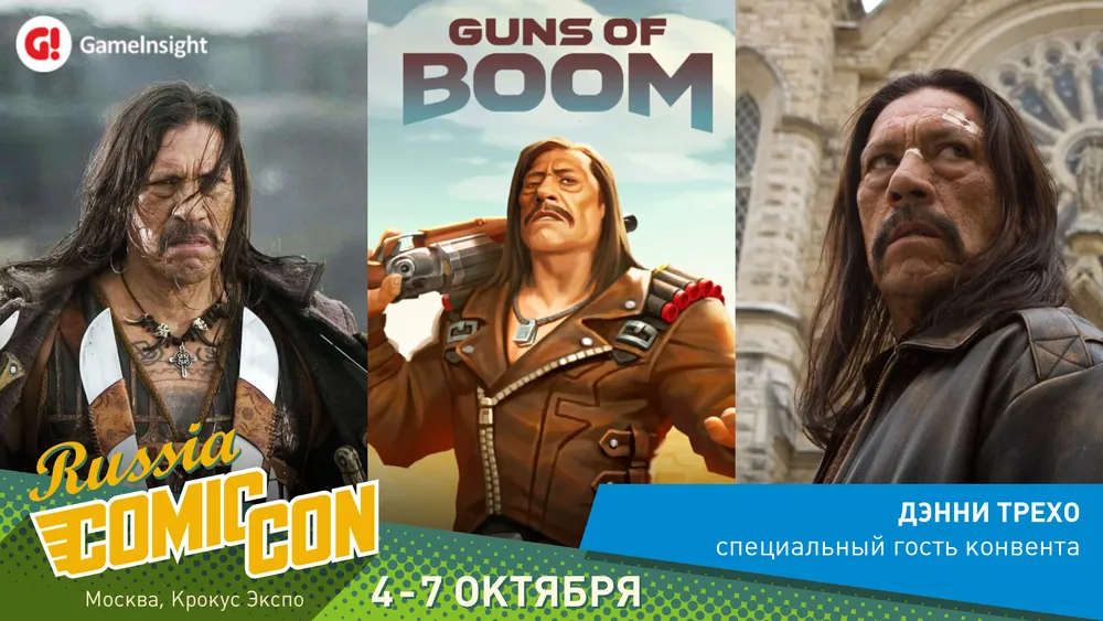 Благодаря студии Game Insight, Comic Con Russia посетит американский экшен-актер Дэнни Трехо. Его брутальные образы известны каждому: «Мачете», «От заката до рассвета», «Воздушная тюрьма», «Крутой чувак», «Во все тяжкие», «Сыны анархии» и другие. Всего на актерском счету Дэнни около две сотни ролей. Кроме того, он стал лицом популярного мобильного шутера Guns of Boom от Game Insight, ведущего разработчика и издателя мобильных игр. Актер озвучил реплики для нового режима «Против всех» и появился в игре в качестве своей виртуальной копии.