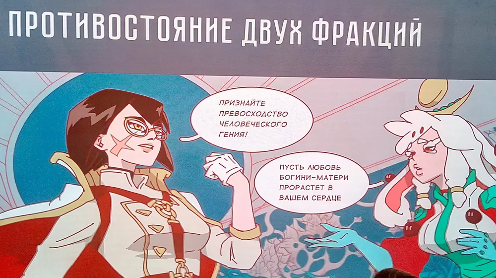 Следующая игра создаётся всего одним автором -зато с непомерными амбициями, насколько я могу об этом судить. Я видел её на основной выставке, но не заинтересовался: показалась мрачноватой. Тем не менее, молодёжь играла.