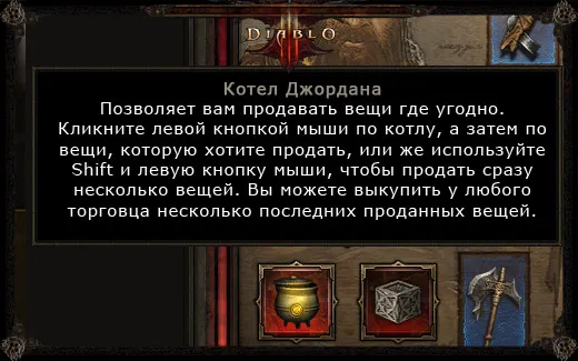 Вскоре после того, как вы начнете свое путешествие, вы получите маленький, но очень полезный артефакт: котел Джордана. Отныне если вам нужно продать свои вещи, больше нет необходимости возвращаться в город и искать торговца: котел выполняет функции скупщика и превращает любой помещенный в него предмет в соответствующее количество золота, как если бы вы продали эту вещь торговцу. В Diablo III золоту можно будет найти самое различное применение: от оплаты услуг ремесленника до ремонта поврежденных вещей и покупки дополнительных ячеек инвентаря.