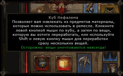 Куб Нефалема - другое очень полезное устройство, которое вы получите в ходе своих приключений. Он работает так же, как и котел Джордана, но есть у него и важное отличие. Кликнув по нему, вы сможете "разобрать" ненужные вам вещи (оружие, броню, кольца, руны, амулеты) на составные части, извлекая таким образом сырье из вашей добычи. В ходе этих превращений базовая вещь уничтожается, однако у вас остаются самые разные материалы. Чем более редкую вещь вы переработаете в Кубе, тем более редкие, даже уникальные материалы вы сможете из нее извлечь. Из простых вещей вы сможете получить простое сырье, а из редких вещей - мощные субстанции, которые впоследствии можно использовать для создания уникальных по силе предметов и заклинаний. У материалов огромный потенциал, и вам наверняка захочется иметь большой их запас на все случаи жизни.