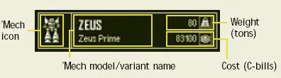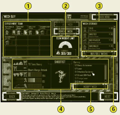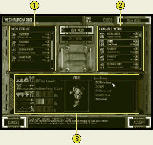 Нажав кнопку Buy/Sell ’Mechs на экране лаборатории, вы попадете на экран покупки мехов. Когда вы покупаете или продаете меха, ваш денежный счет (отображается в верху экрана), соответственным образом меняется. Мехи, которые вы не можете себе позволить, выглядят темнее и не могут быть выбраны. Стоимость покупки и продажи любого меха одинакова, нет никаких торговых издержек.