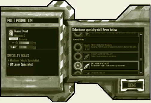 Пилоты из десантной команды, показавшие себя хорошо на миссии и повысившие свои навыки стрельбы и управления мехом, могут получить повышение в ранге и тренировку особых умений. Более подробно о рангах и особых умениях в разделе «Водители мехов» в посте о персонажах.