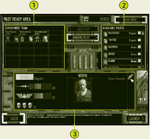 Изучите пилотов и выберите, кто будет управлять мехами десантной команды на этом экране. Назначение нужного пилота на нужный мех – ключ к успеху миссии. У водителей боевых роботов есть различные умения – преуспевший в управлении тяжелыми мехами, вооруженными автопушками, водитель будет плохим кандидатом на управление легким мехом, вооруженным энергооружием.
