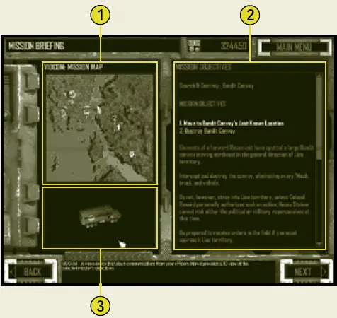 - 1. Карта миссии Маршрутная спутниковая съемка района предстоящей операции. Пронумерованные цели миссии отображаются в связке с этим изображением. Нашивка командующего указывает на стартовую позицию.