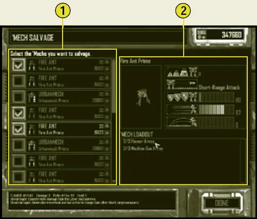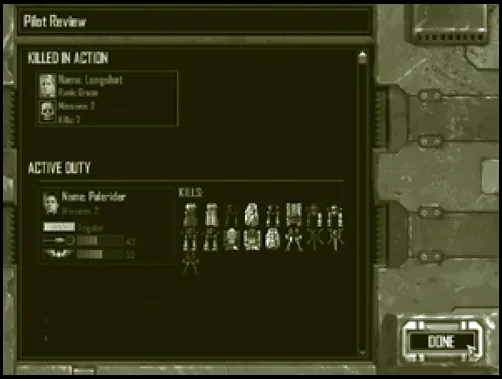 Нажмите Done, чтобы перейти к экрану статуса пилотов. Покинув экран трофейных мехов, вы не сможете к нему вернуться.