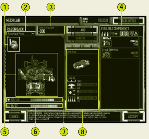 Чтобы завершить модификацию меха, нажмите Accept. У вас должно быть достаточно денег, чтобы оплатить изменения. Далее вы должны назвать и сохранить модификацию. Чтобы отменить изменения и вернуться в механгар, нажмите Cancel.