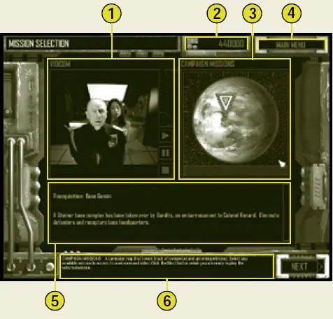 - 3. Миссии кампании Спутниковое изображение карты планеты с указанием доступных миссий. Кликнете по любой для просмотра видеобрифинга и описания.
