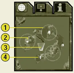 - 2. Сенсорные метки Зеленые точки обозначают членов вашего отряда, синие точки – союзников, а красные точки – противников. Выбранные боевые единицы отмечаются более ярким цветом.