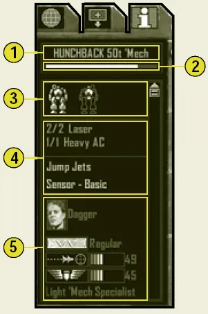 На этом экране отображается полная информация о выбранной единице и, если это мех, о пилоте.