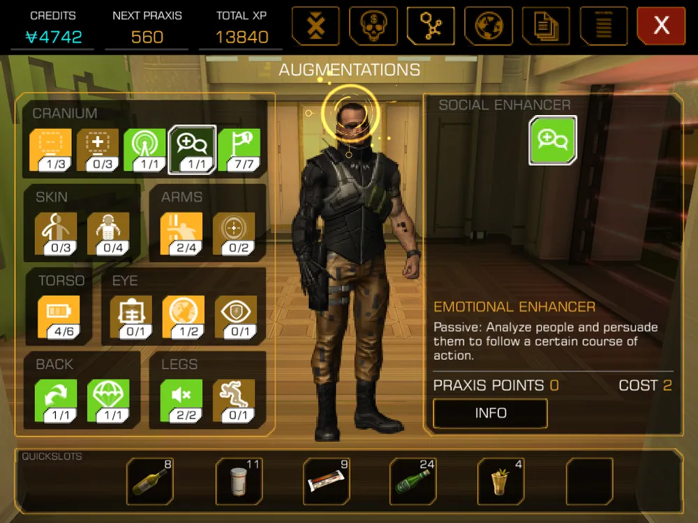Магазин, к слову, в игре всего один - внутриигровой, доступный в любой момент, что очень сильно облегчат игру и это не есть хорошо. К счастью, встроенные покупки, хоть и присутствуют, но игра не вынуждает к ним прибегать, иначе это было бы свинством со стороны разработчиков. Вообще, за все время игры я в магазине купил только арбалет (которым в итоге не пользовался) и одну ЭМП-гранату. Все остальное, при описанном выше скрытном и вдумчивом прохождении игры, добывается без подобных легализованных читов и в достаточных для интересной и не слишком легкой игры количествах. Ну а Праксисов и вовсе хватает за глаза, тем более особой необходимости развивать активные аугментации нет, а чем сильнее развиты пассивные, тем больше возможностей для получения дополнительного опыта и тем больше Праксис-китов. Круг замкнулся.