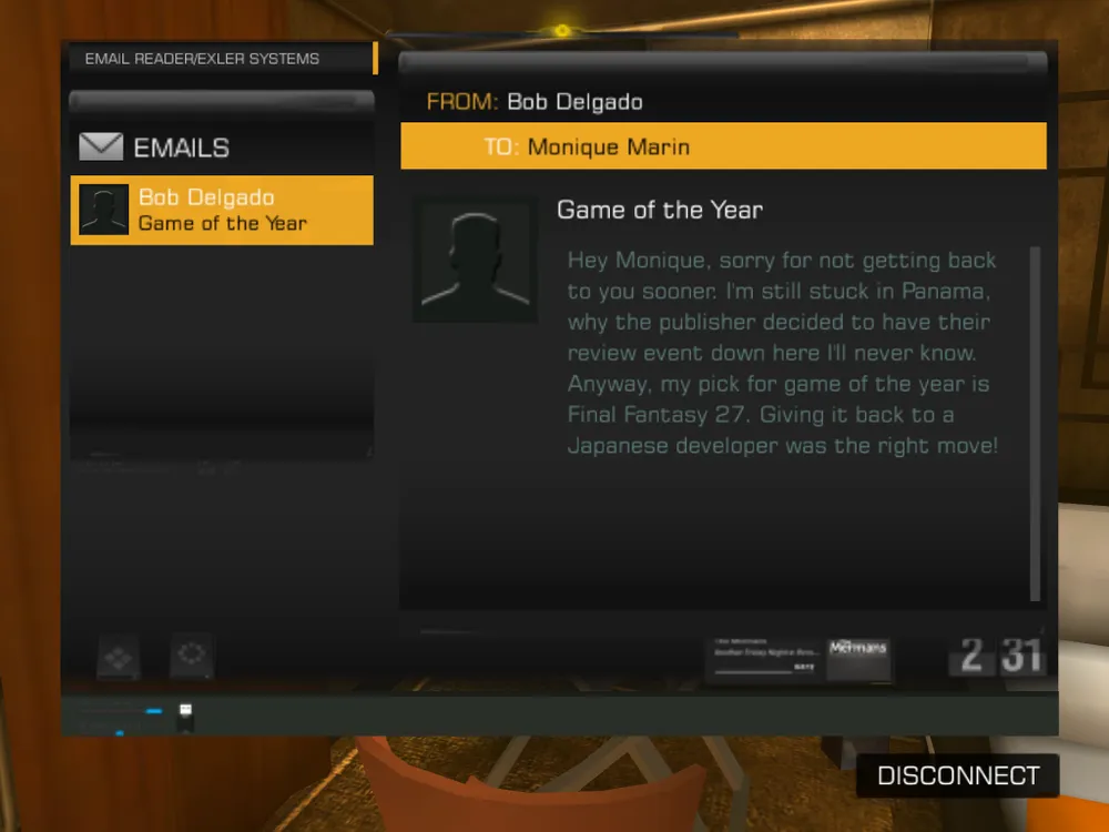 Вторым камнем в огород графики будет качество двухмерных элементов и, прежде всего, менюшек. Когда смотришь на это все, складывается ощущение, что UI изначально делали под куда более низкое разрешение, а потом решили просто растянуть, дабы не перерисовывать заново. Особенно это заметно на экране аугментаций. Ну и иногда "радует" мини-ролик во время оглашения. Радует тем, что место действия ролика может быть совсем не там, где мы застали незадачливого врага. Зато звук вышел на славу. Мрачноватая электронная музыка удачно дополняется шумом города, звуковыми эффектами и прекрасной озвучкой. Последнее касается не только основных персонажей, но даже упомянутых выше неказистых буратин, которые иногда выдают замечательные фразочки в адрес героя. Кстати, в игре достаточно много пасхалок для внимательных игроков, не ленящихся читать электронные письма, ПДА и книги. Вот пара примеров: