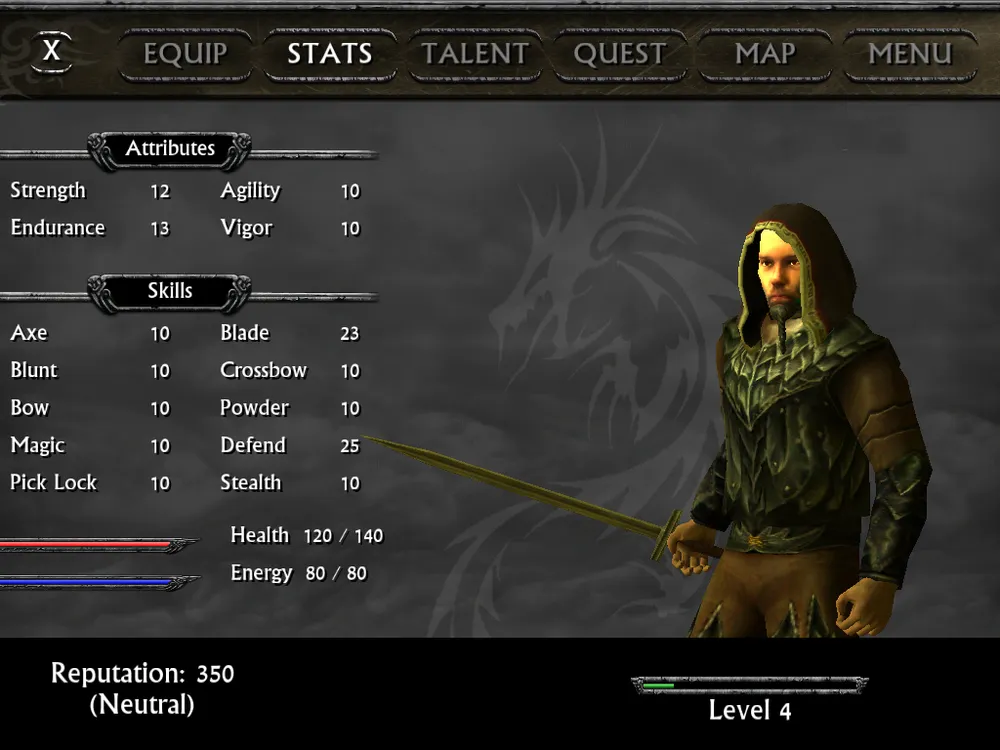 Дабы не быть битым труЪ ролевиками, не буду причислять игру к ролевому жанру, основываясь лишь на наличии сменной экипировки, левелапов и лута с монстров. Ravensword: Shadowlands может похвастать множеством врагов и монстров, многие из которых вполне себе смертельны для героя. И, конечно, весьма не плохой системой развития персонажа. Мы имеем в сущности три ветки развития: основные атрибуты (сила, ловкость и так далее), таланты (четыре и весьма различные между собой ветки) и опыт владения оружием. Первые две улучшаются по мере получения уровней, последняя - во время использования того или иного оружия. Система наиболее приближённая к реальности и при этом не лишающая манчкинов радости истребления толп врагов. Так что, в свете наличия не плохих диалогов, открытого мира и множества элементов экипировки, ролевую часть можно признать весьма годной.