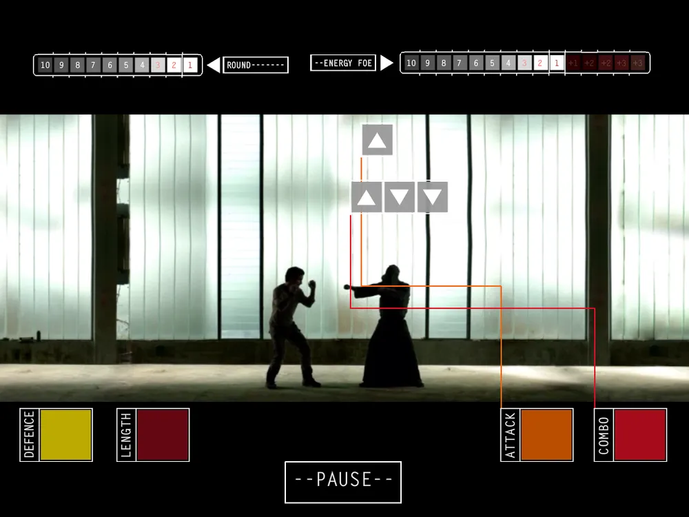К сожалению, открывается он быстро. Виной тому просто чудовищная скоротечность игры. В ней всего пять разных противников. Я понимаю, что отснять еще больше, учитывая совсем не халтурное качество видео материала, было сложновато, но пять это все же СЛИШКОМ мало. Очень надеемся, что в последующих обновлениях нам таки добавят еще врагов, а пока будем чистить лица старым, отыскивая последовательности, которые ведут к еще не увиденным кадрам. Дело в том, что первая ошибка в нажатии нужной клавиши не фатальна и после нее, если вы не будете ошибаться - вы таки нанесете врагу результативный удар, посмотрев очередной эффектный фрагмент под крутую и пафосную музыку. Кстати, в Stay Dead нет привычных для любителей файтингов полосок жизни. Каждый бой идет десять ходов-раундов. В каждый раунд вы можете нанести простой удар (минус одно очко энергии врага) либо провести комбо (от одного до четырех минусов к вражьей энергии). Задача - свести энергию врага к нулю, а потом навалять ему еще немного сверх меры. В случае вашей победы, герой проведет эффектное добивание врага и будет готовиться к бою со следующим. И процесс этот реально затягивает, как бы смешно это не казалось со стороны.