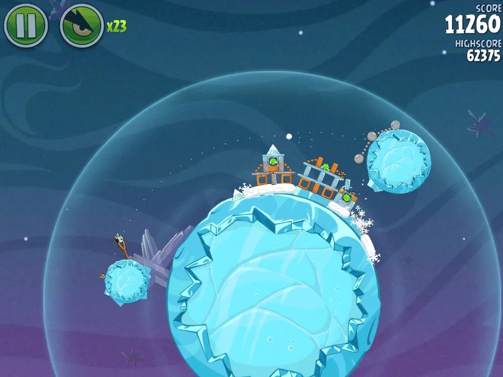 Поговорим теперь о друзьях наших пернатых. Помимо старых и знакомых нам птичек появилась новая - ледяная. Эта коварная крылатая бестия, выглядящая как кубик льда, может не только зашибить свинку или разбить балку (доску\льдышку), но и взорваться, превращая все, в определенном радиусе, в лед. А лед, как известно колкий. А всякие конструкции, в которых резко разбивает один из элементов имеют свойство разваливаться и погребать под собой всех, кто в этих конструкциях находится. Так же, обломками можно зашибить бонусы, выполненные в виде мерцающих фиолетовых грибов.