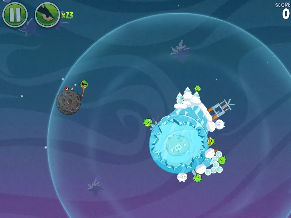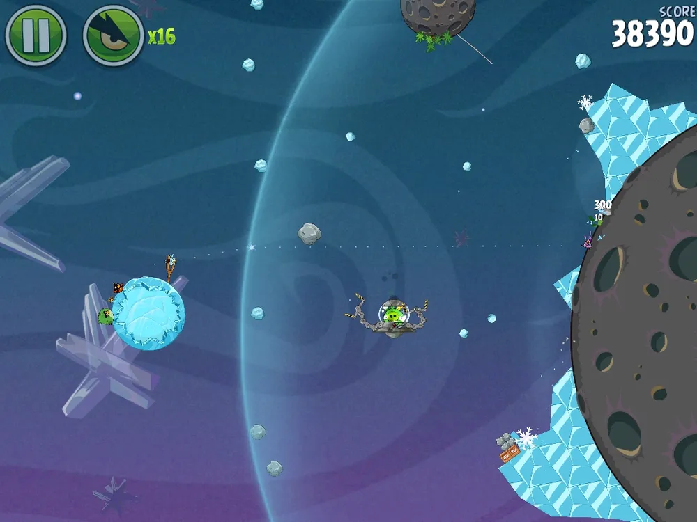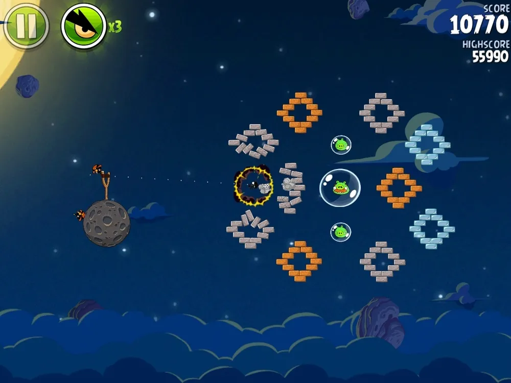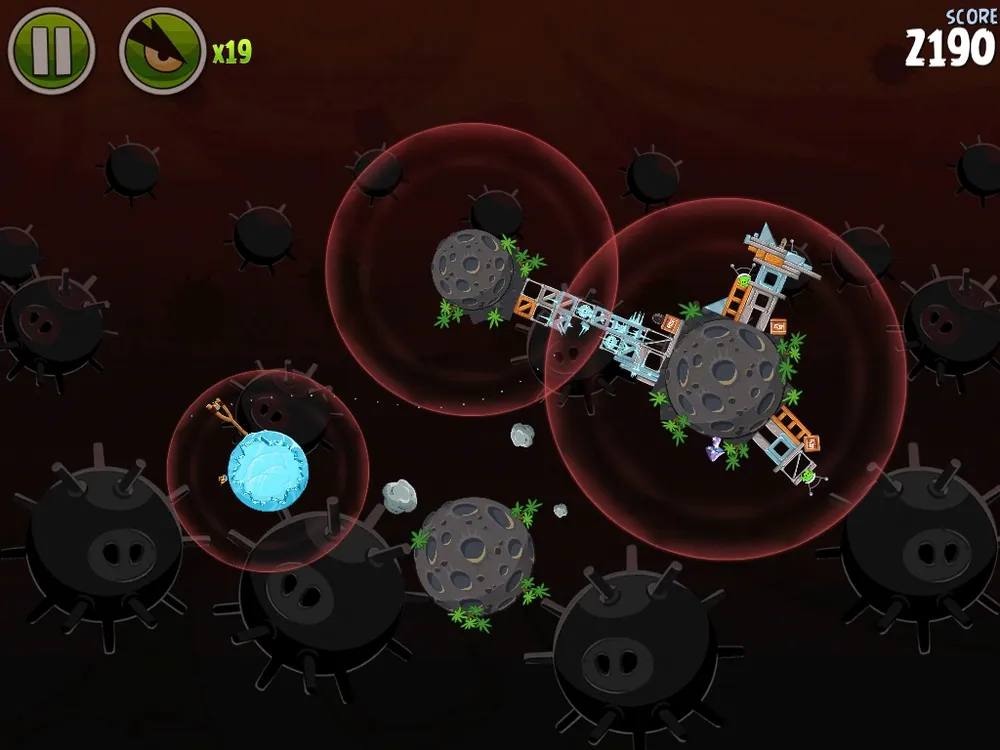 И вот на использовании гравитации и невесомости построены практически все местные паззлы и задания. Лично мне особенно нравятся задачки, когда решение предусматривает использование всех особенностей физики игры, например: запустить птицу, чтобы с помощью гравитации облететь зону с обратной стороны, столкнуть с орбиты астероид, который упадет прямо на ящик с динамитом и осколками размажет всех хрюшек по твердым поверхностям, как масло ножом. Да, вот такой вот я садист. Но надо признать, что многие задания решаются далеко не с первого раза, и даже не с пятого. Ну это если стараться на три звезды все делать. Если чисто пройти - то все довольно легко, но это ведь не интересно...