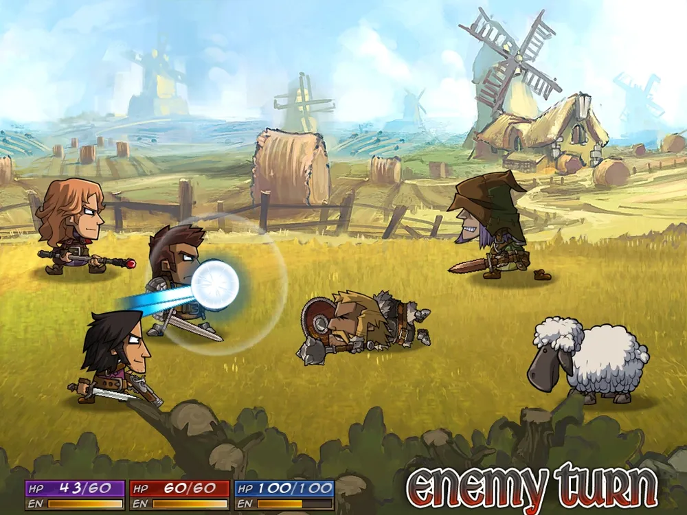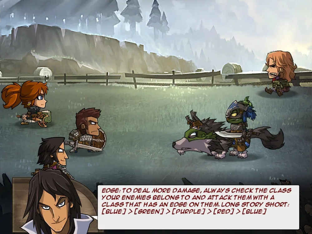 Но не только преимуществами над теми или иными классами жива местная тактическая система. Важную роль в достижении победы играет то, как расставлены на поле боя ваши воины. Оптимальная расстановка такова: первую линию занимает танк, который будет принимать на себя большую часть ударов противника. На второй линии лучше поставить разбойника или класс схожий с ним. Ну а на третью - мага. Дабы воины не сжились после пары ходов, они наделены способностью блокировать вражеские атаки, стоит только игроку вовремя тапнуть по нужному воину. Похожим способом, но во время уже хода игрока можно натравить на цель сразу несколько своих героев, достаточно только своевременно тапа.