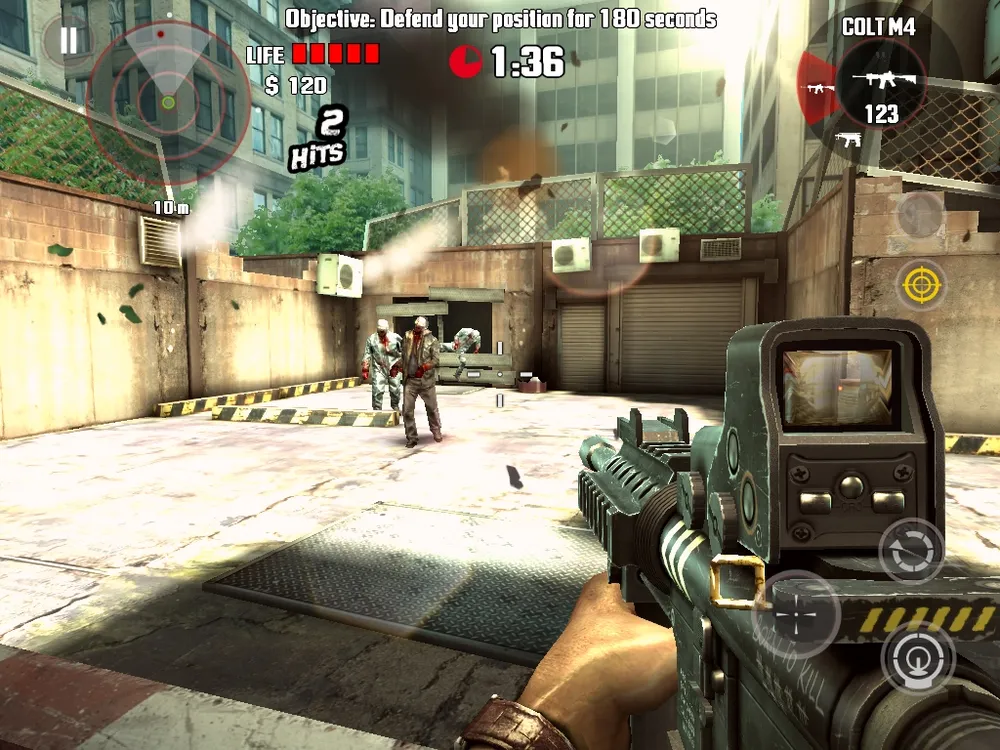 Первая игра на сегодня принадлежит к жанру шутеров. Если точнее, то она является своеобразным клоном режима зомби из Call of Duty Black Ops. Со своим сюжетом, про очередной зомби-апокалипсис, про выживших, про бравого героя, помогающего этим выжившим и все такое в классическом ключе. Все персонажи стандартны и шаблонны и это было бы минусом для какого-нибудь шутера, завязанного на сюжете, но Dead Trigger не такой. Это подвид "выживалок", основная масса которых представлена dual-stick шутерами и слелешерами, наподобие Crimson Land или бесконечных творений от GLU. Однако сейчас мы имеем дело с геймплеем классической "стрелялки" из рода Painkiller'ов и Serious Sam'ов. Суть проста: игрока, то есть нас, запирают на арене, а потом туда начинают лезть, ползти и набигать зомби. Игра разделена на миссии, часть из которых - сюжетная, а часть - служит для заработка опыта и денег.