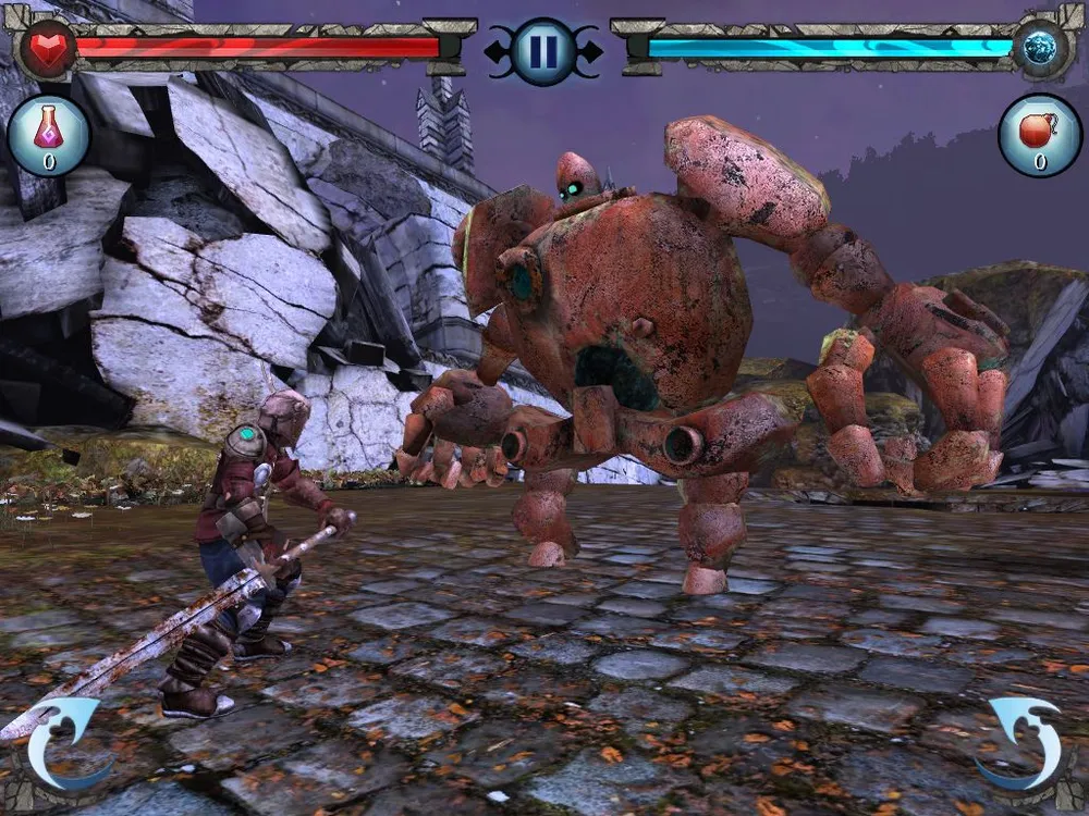 Не самая хитрая завязка, да? Ну так ведь много превосходных произведений имею весьма банальное начало. И история в Horn действительно стоящая. Хотя даже не столько фабула истории - сказкой сейчас никого не удивишь - сколько само путешествие по сценарным ходам и сюжетным поворотам. Игра радует своих игроков замечательными, хоть и немного наивными диалогами, которые озвучены не хуже иных больших проектов. Надо сказать - иного от авторов замечательной и атмосферной Dark Meadow ждать и не приходится. Данное утверждение подкрепит уже даже первая встреча с первым же противником, дарящая нам сочный диалог и обучение азам боя. И вот тут лучи радуги стоит притормозить. Боёвка в игре продолжает традиции Infinity Blade, а это значит, что нас ждут бои один на один с противником, увороты и удары, совершаемые росчерками по врагу.