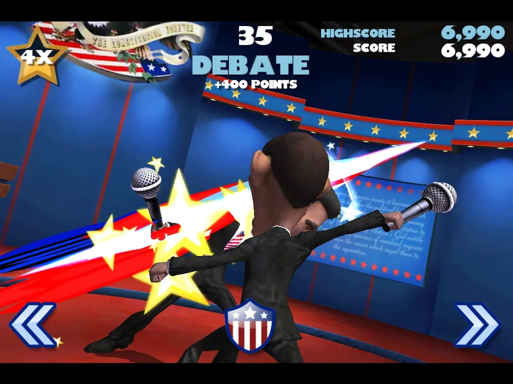 Перед каждым боем можно выбрать облик (строгий костюм, кимоно и т.п.), оружие (микрофон, сосиску на вертеле и все в таком духе) и аксессуар. Далее мы можем прикупить за игровые монетки разные перки, облегающие жизнь в предстоящих дебатах (так тут называют бой). Ну а дальше начинается классический геймплей Infinite Blade: увороты, удары, блок и тому подобное. Если вам удастся нанести врагу мощный удар, то с него посыпается денежки, которые желательно хватать, тапая по ним. После окончания дебатов вам выдадут статистику, рейтинг и набранную сумму денег, на которые вы сможете прикупить себе новые перки и шмотки. Еще можно похвастать в твиттере своими успехами за приятные плюшки от игры. Само собой, денежки можно не зарабатывать тяжелым политическим трудом, а купить за реальные баксы, но зачем?