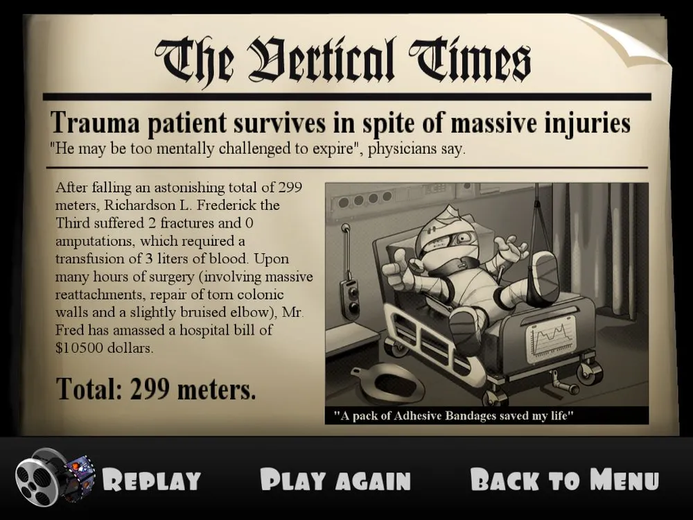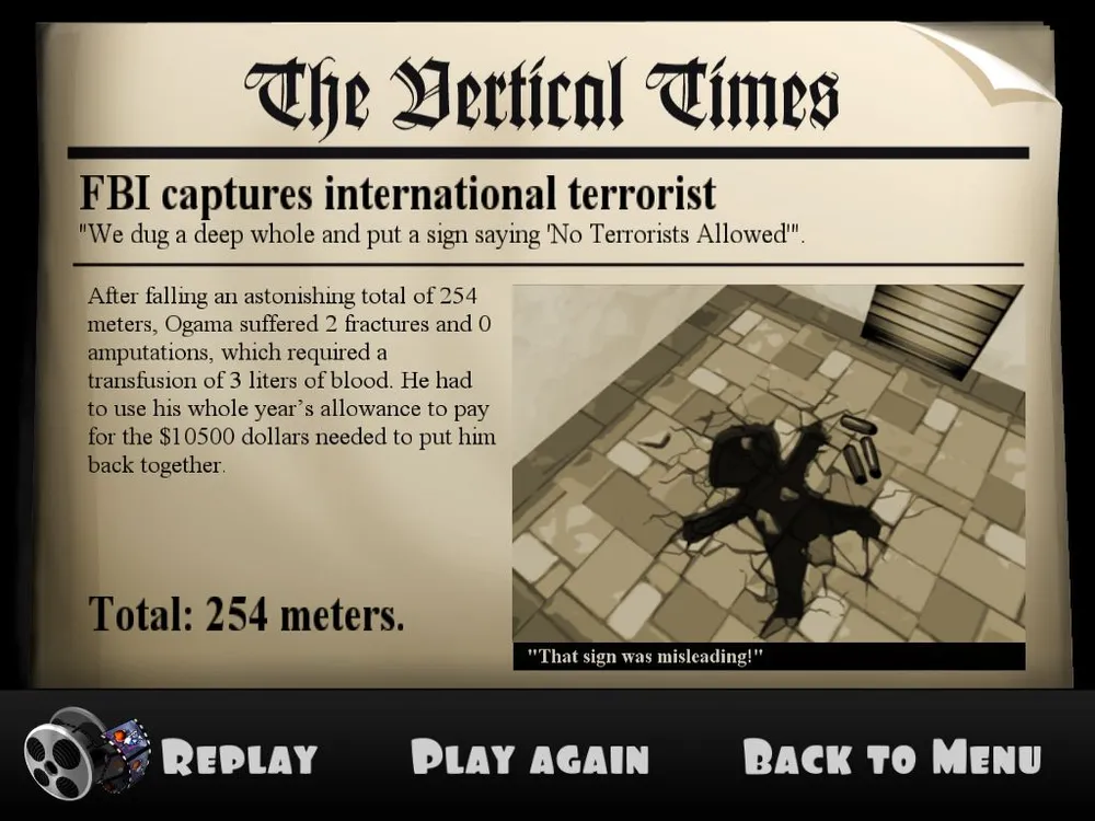 Кстати о финальных экранах. Они выполнены в стиле газетной полосы, на которую заносятся ваши "достижения" в текущей сессии. Вот примерчики: