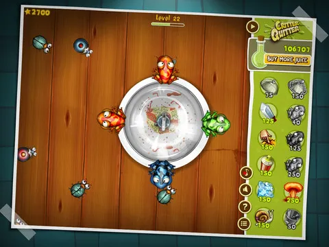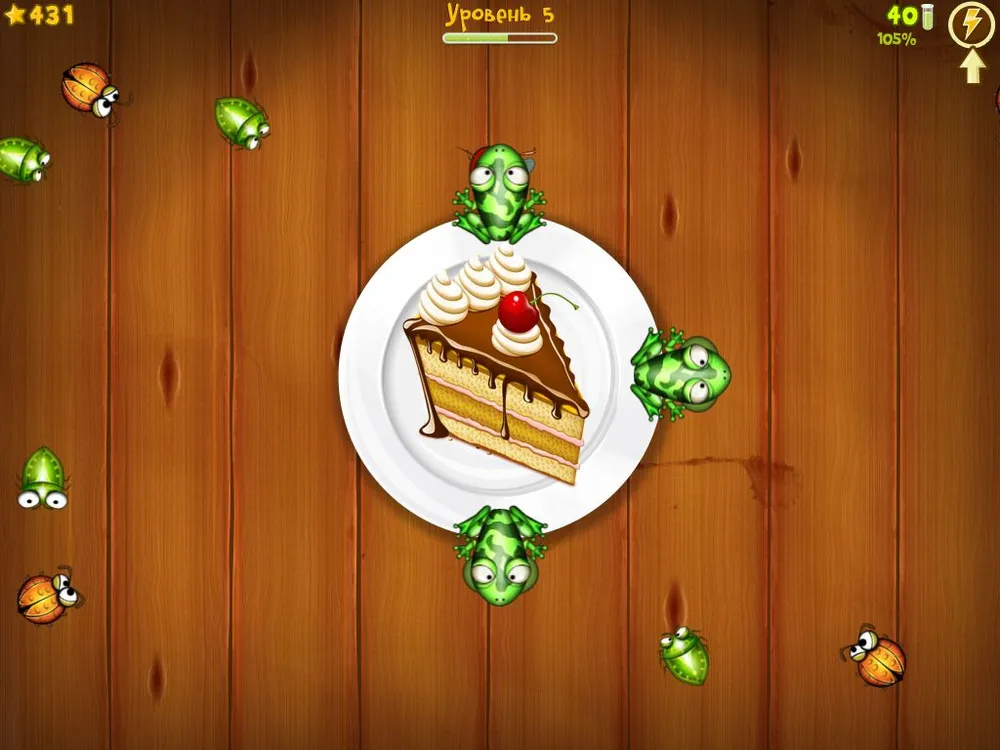 В деле защиты тортика от мерзких жуков нам помогают "башни" и спецспособности, вроде "Мачете", которое позволяет рубить сразу несколько жуков. Башнями в игре являются несколько видов лягушек, которые с удовольствием полакомятся жучинкой. Отличаются лягушки не только цветом, но и аппетитом и скоростью поедания.
