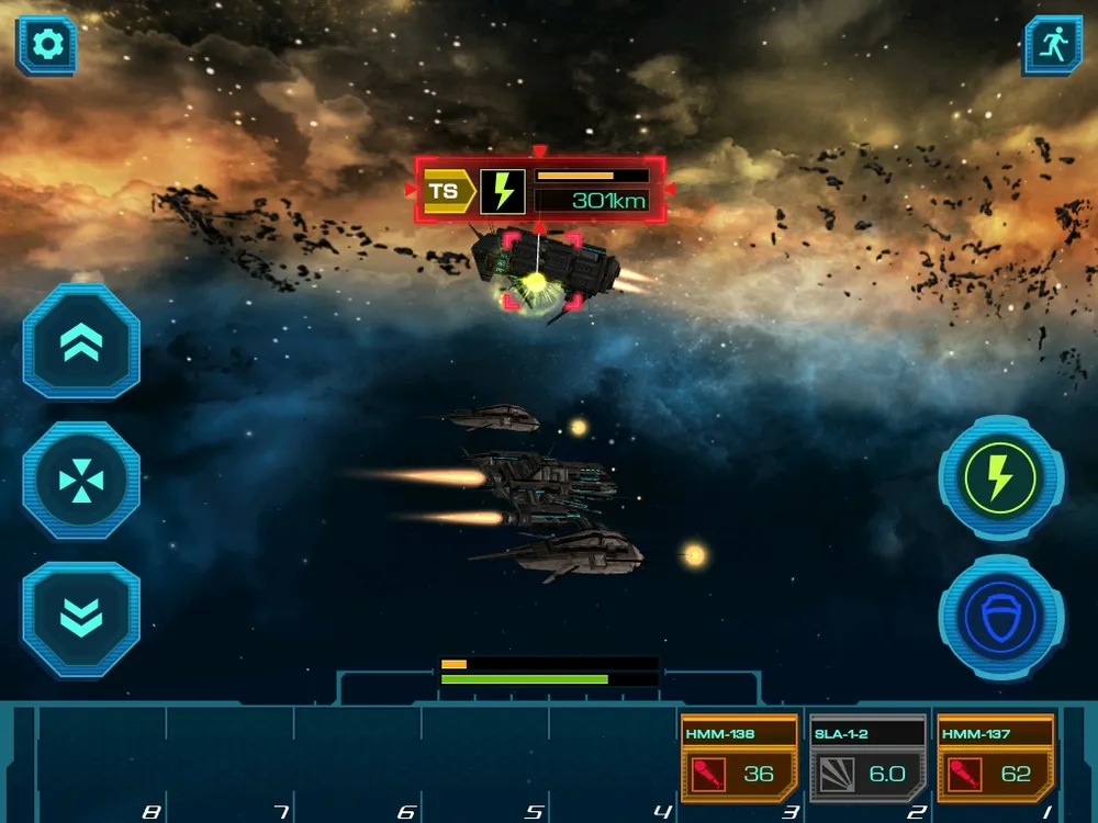 Во-вторых - бой. Нет, он интересный, не слишком скучный (особенно с превосходящими силами), но управление сделано не особо удобно: можно управлять приближением\отдалением от захваченной цели, активацией щитов и стрельбой.