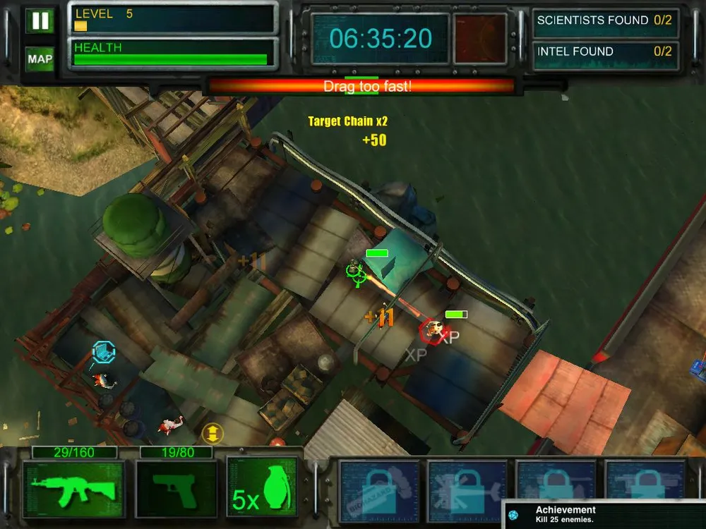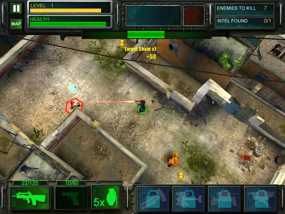 Если говорить словами, то от нас требуется провести пальцем через противников и тогда наш подопечный устроит им геноцид. И чем больше врагов в цепочке - тем больше очков мы получаем за их убийство. Ещё одним мерилом получаемых денег является система репутации, которая растет если вы выполняете все миссии подряд и без промахов (не перезапуская, не проигрывая и т.п.) и падает, в обратном случае. Кстати, потратить честно заработанные денежки можно не только на оружие, но и на полезные гаджеты, на подобие роботов поддержки, турели или газовой бомбы. Обычно они не так полезны, но на личном опыте могу уверять: иногда в заданиях по ремонту без этих помощников не выжить.