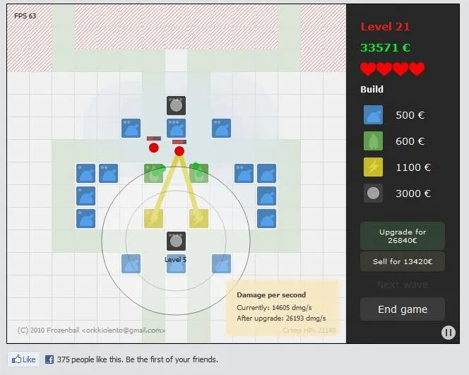Первые робкие попытки начать использовать возможности HTML5 начались уже в этом году. Одна из таких - пока еще очень простая, но поскольку выбран жанр Tower defenсe, достаточно занимательная игра - этоFrozen Defenсe. В ней традиционно требуется строить башенки, которые не дают врагам пройти. Башенки бывают разных типов, они модернизируются (на это требуются немалые суммы). При необходимости их можно продать.